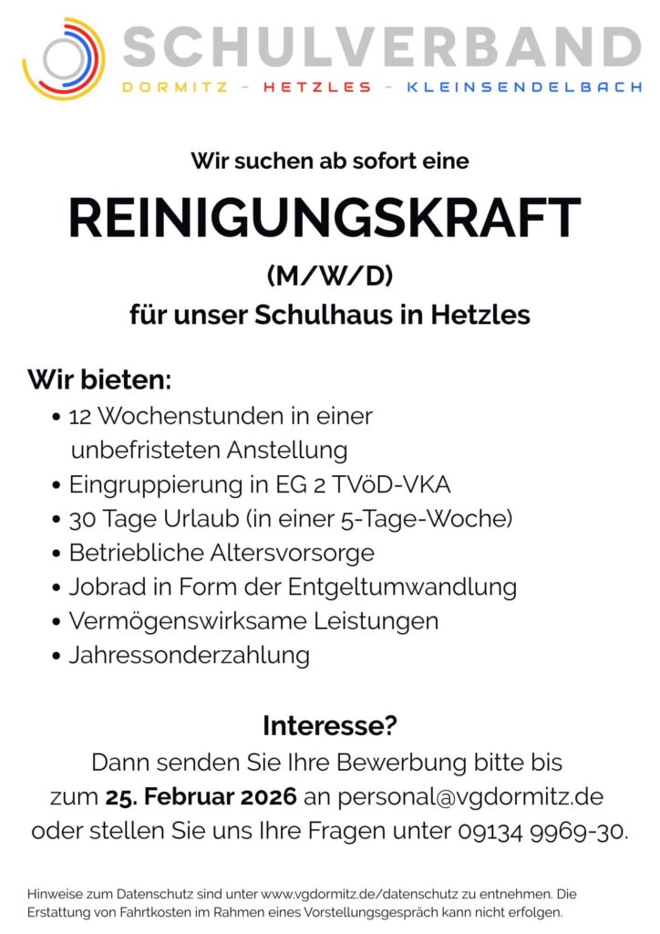 Reinigungsfachkraft (m/w/d) für unser Schulhaus in Hetzles gesucht